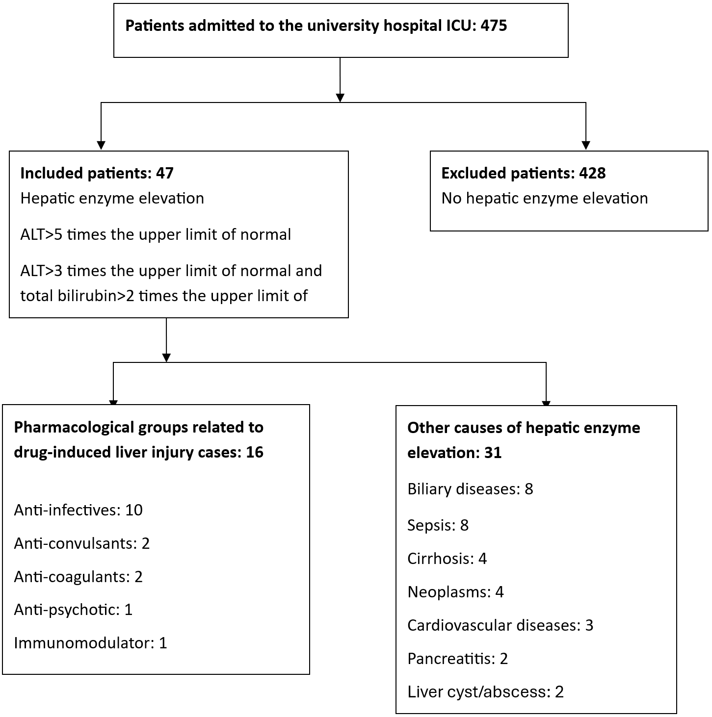 This study provides valuable insight into the incidence, clinical characteristics, implicated agents and outcomes of drug-induced liver injury (DILI) among critically ill patients in a tertiary intensive care unit (ICU) over the span of one year. Our findings indicate a DILI incidence of 9.89% among ICU patients presenting with elevated liver enzymes. In a recent study from a university hospital in Colombia, the 1-year incidence of drug-induced liver injury (DILI) was approximately 6%. Similar to our findings, antibiotics and anticonvulsants were reported as the main pharmacological groups associated with DILI. These results are in line with our observations, further supporting the notion that careful patient selection, close monitoring, and rational prescribing are essential in minimizing the risk of DILI. Consistent with the recommendations of this study, the prompt suspension of the suspected agent should be considered the first protective measure, followed, when appropriate, by modification of pharmacotherapy or the initiation of supportive treatment strategies (17).